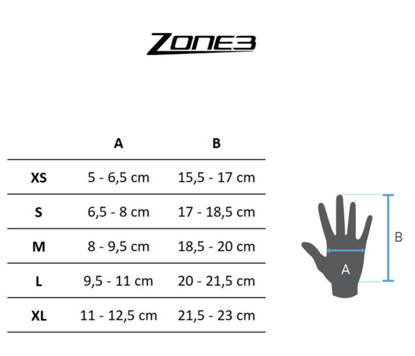 Den primære funktion af Zone3 åben vand svømme handsker er at holde dine hænder isoleret mod kulde. Efter test af svømmehandsker på markedet fandt Zone3, at de næsten alle begyndte at skabe en kunstig "ballon" med vand under svømning og begyndte at glide af hænderne. En designløsning blev fundet ved at øge længden af handskerne, så de kan lægges over eller under våddragten for at sikre, at der ikke er blottet hud, og ved at tilføje en velcro-strop for at holde handsken på plads. Zone3 har også fjernet båndet mellem fingrene, som andre mærker plejer at bruge, for at få svømning til at føles meget mere naturlig og mindre trættende. Til størrelse anbefaler vi størrelse small til damer eller mænd med små hænder og Medium eller Large til mænd baseret på håndstørrelse. Sammen med Zone3 neopren sokker og kasketter er dette noget af det bedst sælgende tilbehør og perfekt til alle, der svømmer i koldtvandsforhold.